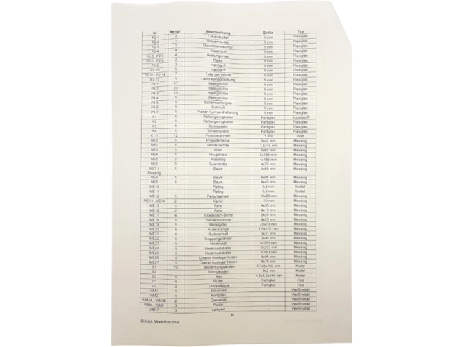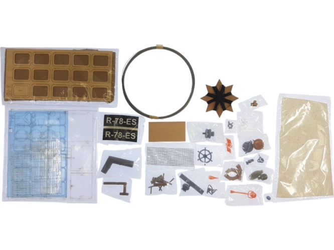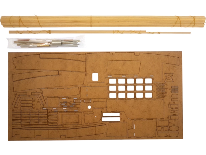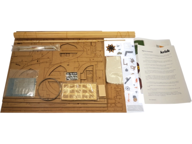 Balení obsahuje laserem řezané dřevěné a plastové díly, dřevěné lišty, kovové trubičky, mosazný fotolep, detaily z 3D tisku. Obrázkový manuál.