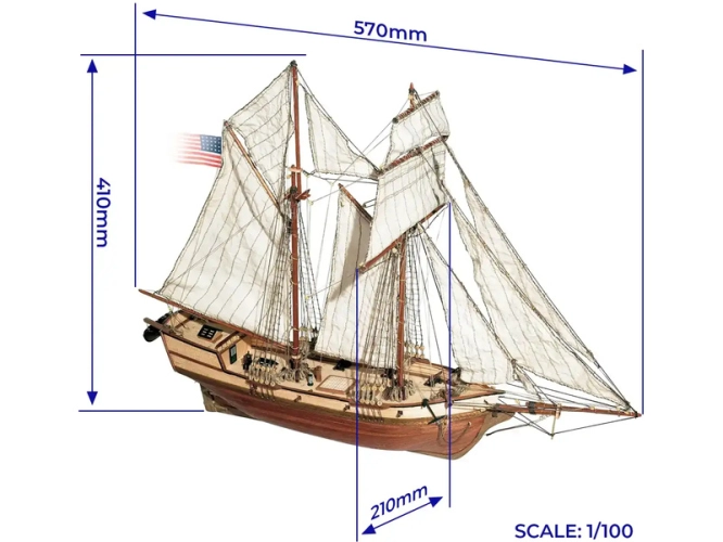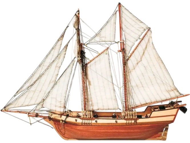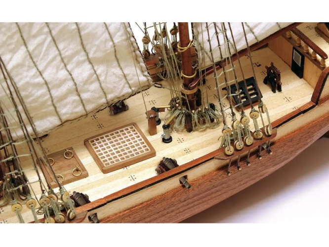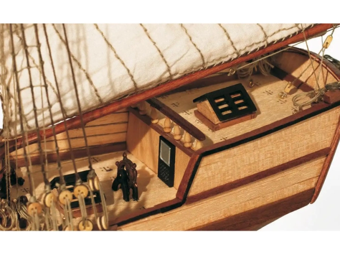 Balení obsahuje laserem řezané dřevěné díly, plaňky, palubu, stožáry, dřevěné díly, kovové odlitky, mosazné díly, lanoví, ušité plachty, stojánek. Manuál a stavební plány.
