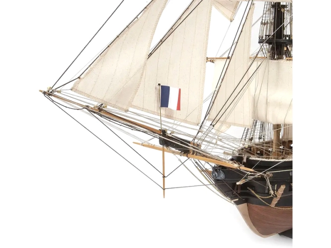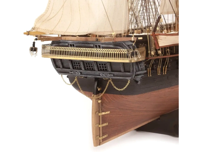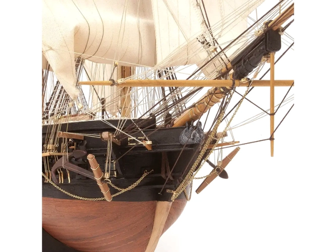 Balení obsahuje laserem řezané dřevěné díly, plaňky, palubu, stožáry, dřevěné díly, kovové odlitky, mosazné díly, mosazné fotolepy, lanoví, ušité plachty, vlajky, stojánek. Návod a stavební plány.