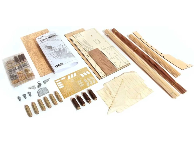 V balení jsou díly pro stavbu - laserem řezané díly, lišty, mosazné fotolepy, lanoví a další.
