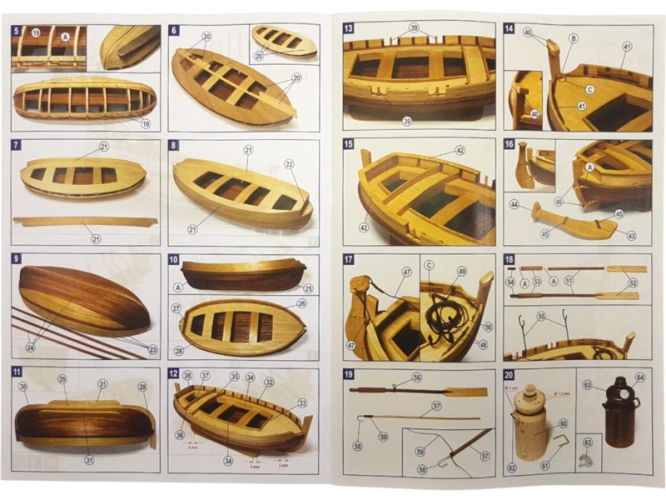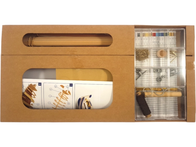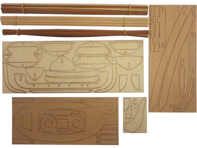Balení obsahuje laserem řezané dřevěné díly, plaňky, frézované dřevěné díly, kovové odlitky, mosazné díly, lana. Návod a stavební výkresy.