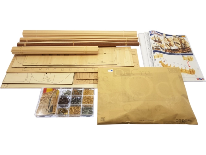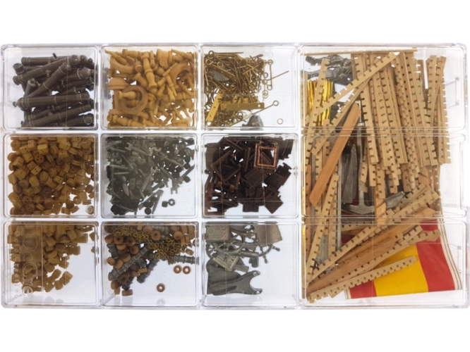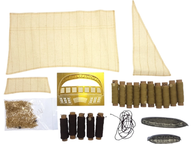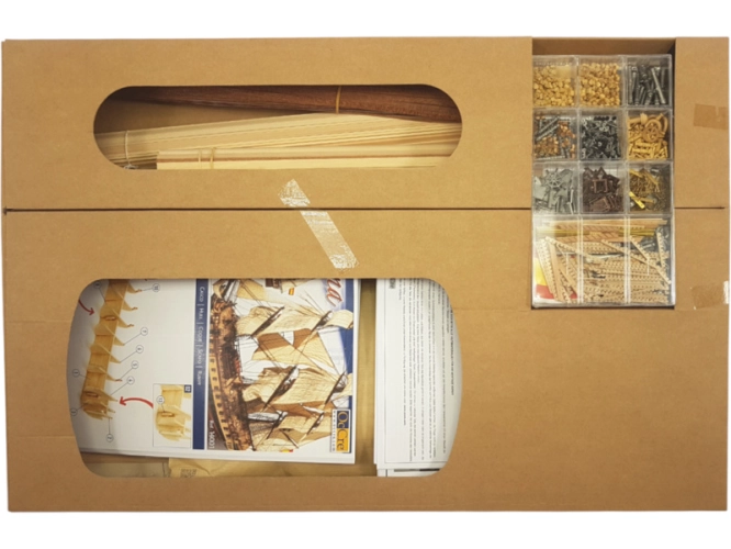 Balení obsahuje laserem řezané plošné dřevěné díly, plaňky, stožáry, frézované dřevěné díly, kovové odlitky, mosazné díly, mosazné fotolepy, lanoví, ušité plachty, vlajku. Návod a stavební výkresy.