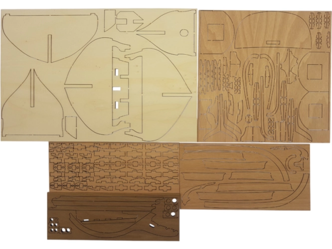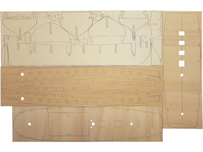 Po otevření víka krabice naleznete špičkově zabalené díly, které jsou výborně chráněné proti poškození a zároveň jsou logicky rozřazeny - dřevěné díly modelu z překližky, lišty a stožáry jsou staženy ve svazcích, plachty jsou uloženy v obálce, drobné součásti uzavřené v krabičce, sada výkresů a manuál.