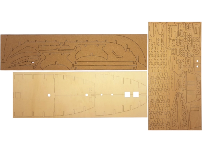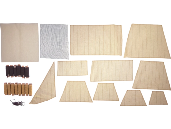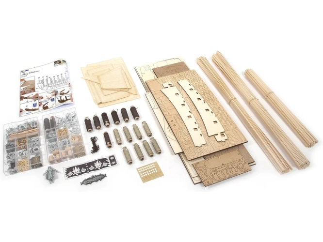 Balení obsahuje laserem řezané plošné dřevěné díly, plaňky, stožáry, frézované dřevěné díly, kovové odlitky, mosazné díly, mosazné fotolepy, čiré plastové destičky, lanoví, ušité plachty, vlajku, stojánek. Návod a stavební výkresy.
