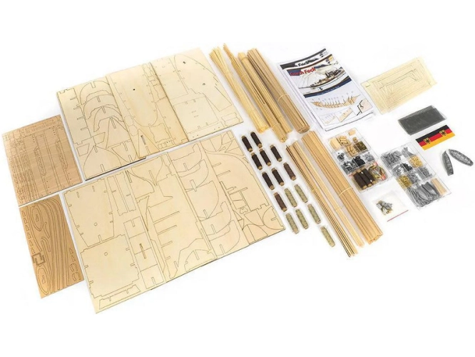 V balení jsou díly pro stavbu - laserem řezané díly, lišty, mosazné fotolepy, lanoví a další.