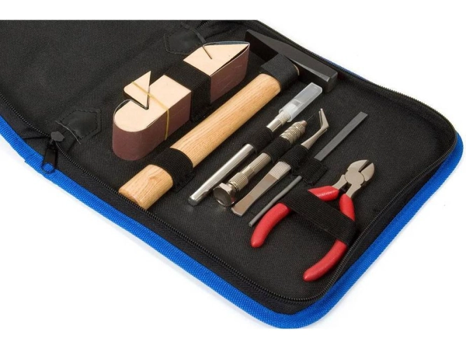 Plastový kufřík obsahující následující nářadí: kleště, ruční vrtačku + vrták, nožík, pilník, hrubý brusný papír, pinzetu a kladívko.