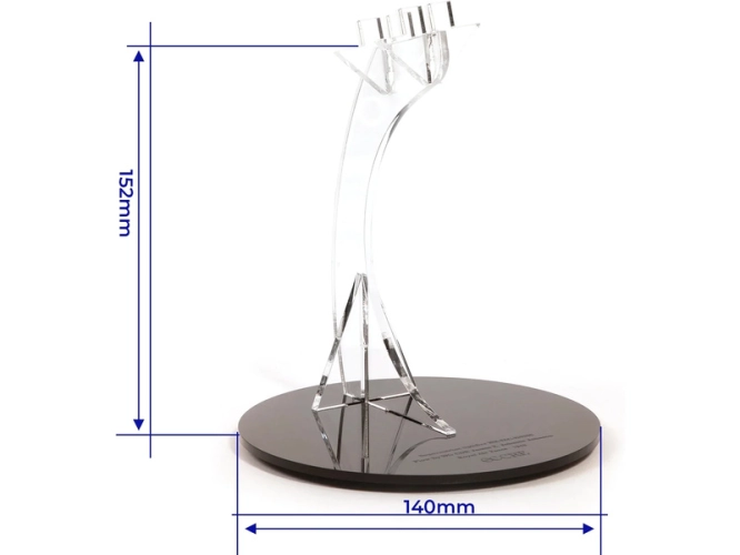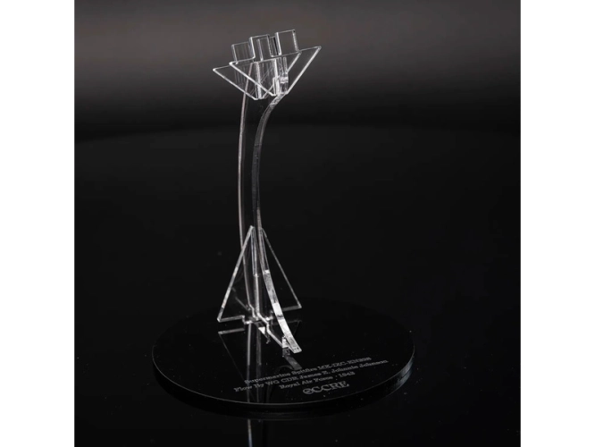 Průhledný stojánek s gravýrovanými informacemi o modelu.