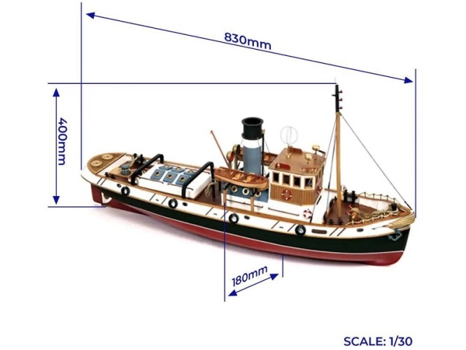 Stavebnice neplovoucího (možnost přestavby na RC) modelu lodi OCCRE Ulises remorkér, v měřítku 1:30. V balení jsou díly pro stavbu - laserem řezané díly, lišty, mosazné fotolepy, lanoví a další. Stavební výkresy a návod.
