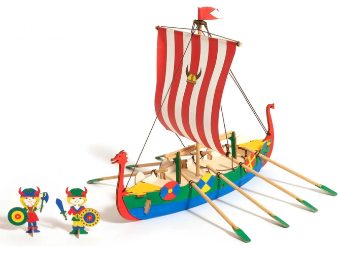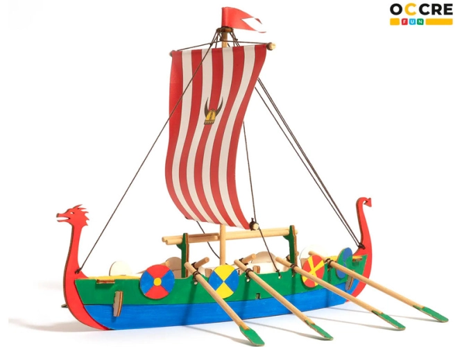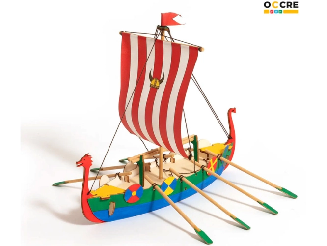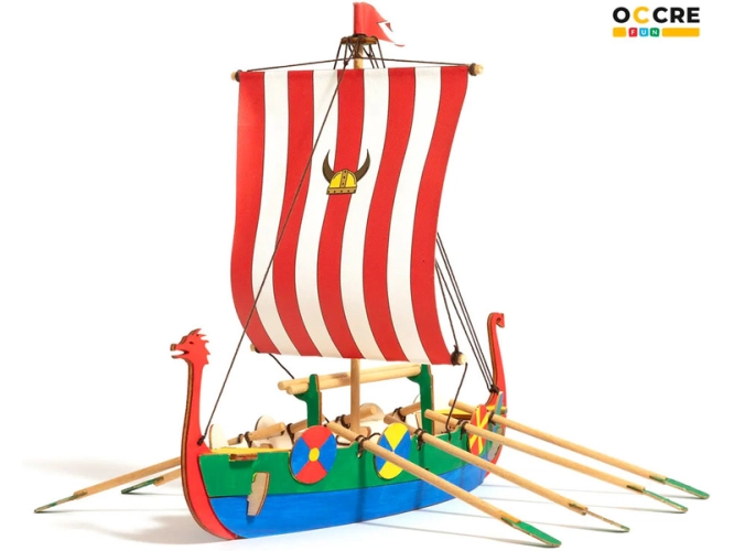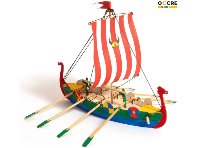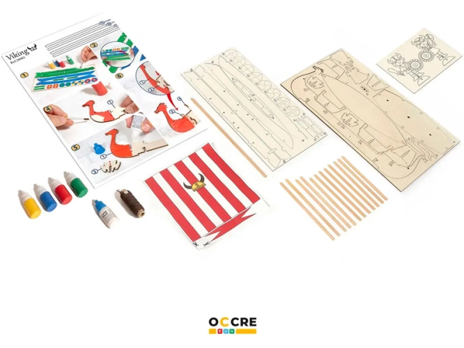 Stavebnice pro děti OCCREVikingská loď. Balení obsahuje: předřezané dřevěné díly, akrylové barvy a štětec, gumičky pro sestavení, bílé lepidlo, barevný ilustrovaný návod krok za krokem.