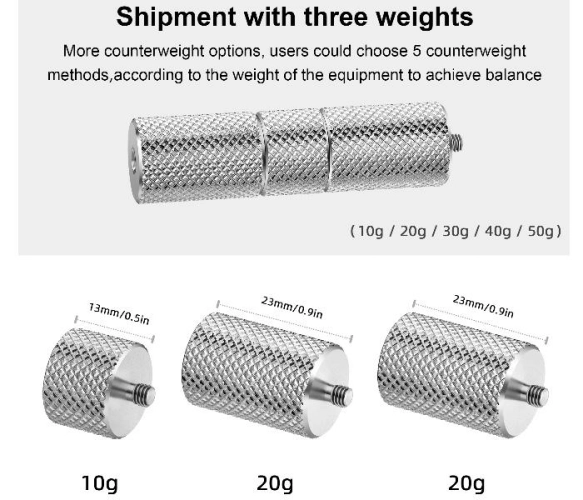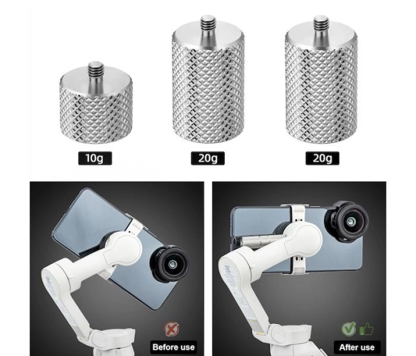 Balancer kit pro DJI Osmo Mobile (2, 3, 4, 5) obsahuje tři protiváhy: 2 x 20g a 1 x 10g. Slouží k vyvážení těžších telefonů nebo přídavných zařízení (např. mikrofon, objektiv), čímž zlepšuje stabilizaci a šetří energii motoru. Snadno se připojuje k gimbalu a zajišťuje plynulý chod. Ideální pro profesionální natáčení s těžšími smartphony.