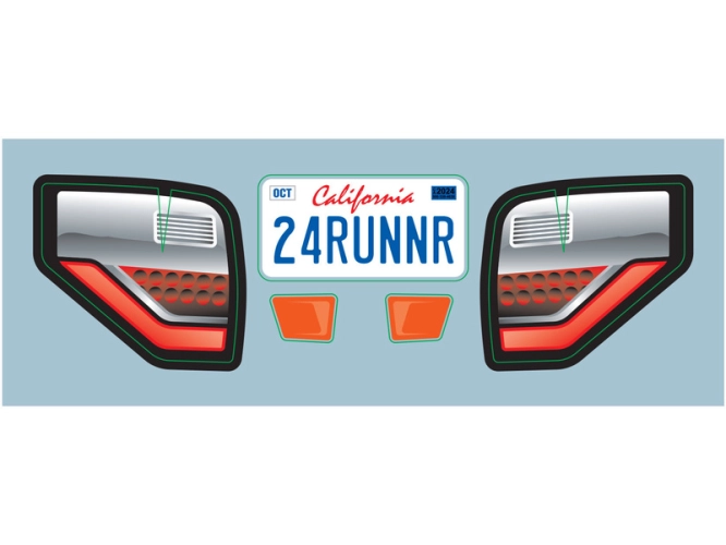 Karosérie čirá 2023 Toyota 4Runner 1:24, okenní vložka, paraboly předních a zadních světlometů, LED diody, přední nárazník, zadní nárazník, kliky dveří, zrcátka, držák předního nárazníku, pant zadního nárazníku, přední uchycení karoserie, zadní znak 4Runner, montážní šrouby, arch samolepek.