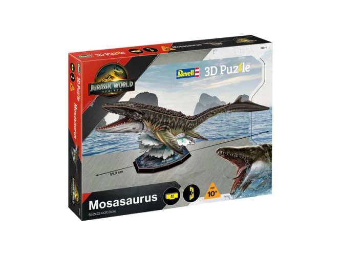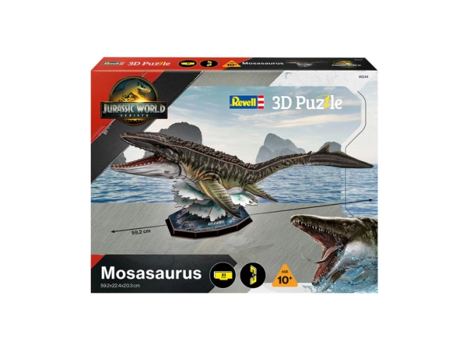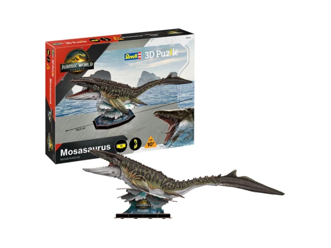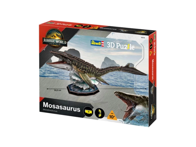 Prostorové 3D Puzzle Revell 00244 – Jurassic World - Mosasaurus. Stavebnice má 83dílků, výsledné rozměry modelu jsou 592x224x203mm.