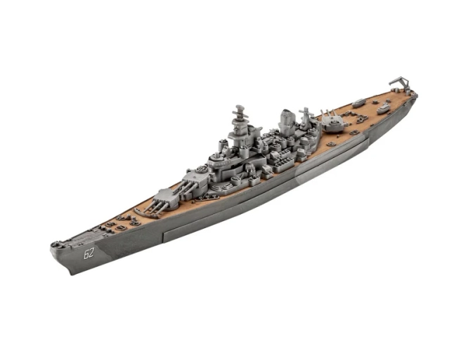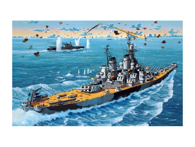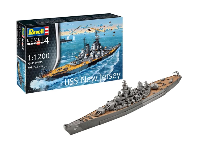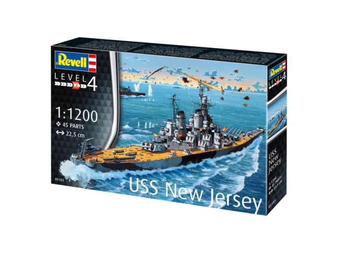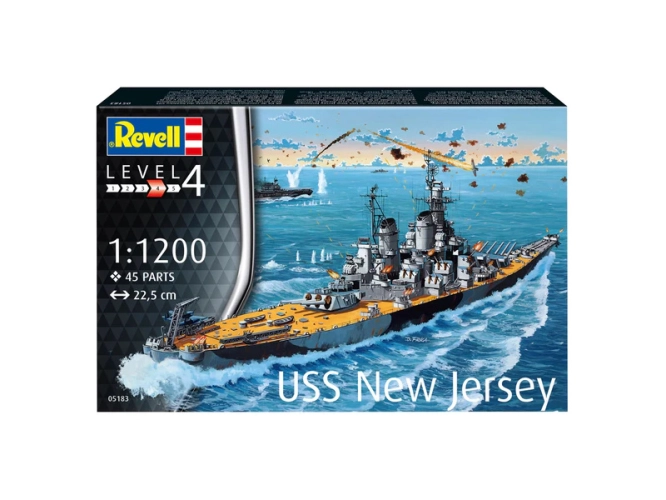 Plastikový model Revell 75183 – loď Battleship USS New Jersey v měřítku 1:1200 ke slepení. Stavebnice obsahuje 45 dílků, délka 22.5 cm, obtížnost 4.