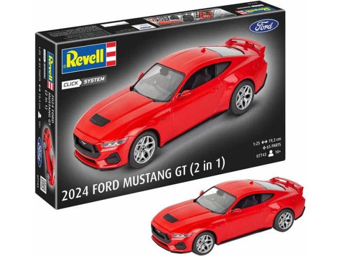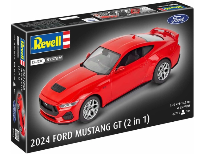 Revell plastikový model auta Ford Mustang GT 2024 v měřítku 1:25 ke slepení. Stavebnice obsahuje 65 dílků, délka 19,3 cm, obtížnost 1.
