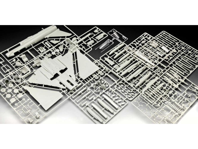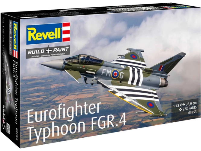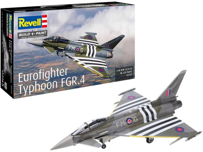 Revell plastikový stíhačky Eurofighter Typhoon FGR.4 v měřítku 1:48 ke slepení. Stavebnice obsahuje 228 dílků, rozpětí křídel 33 cm, obtížnost 5.