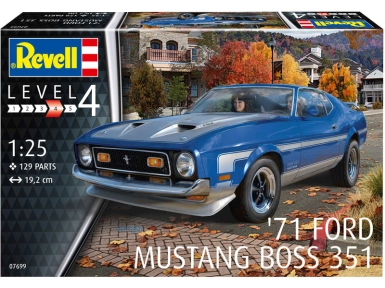 Plastikový model Revell 67699 - auto Ford Mustang 1971 Boss 351 v měřítku 1:25 ke slepení. Stavebnice obsahuje 120 dílků, délka 192 mm, obtížnost 4.