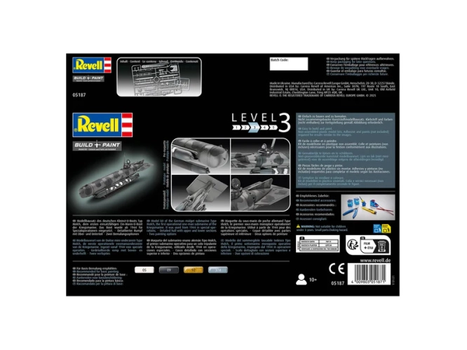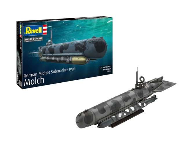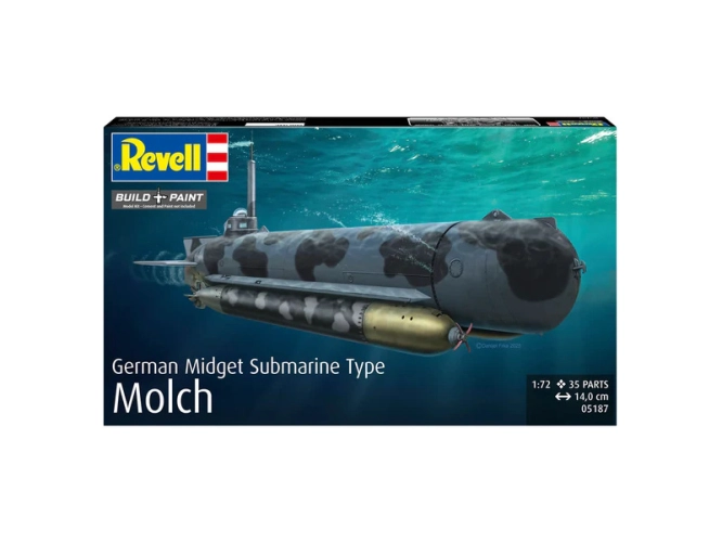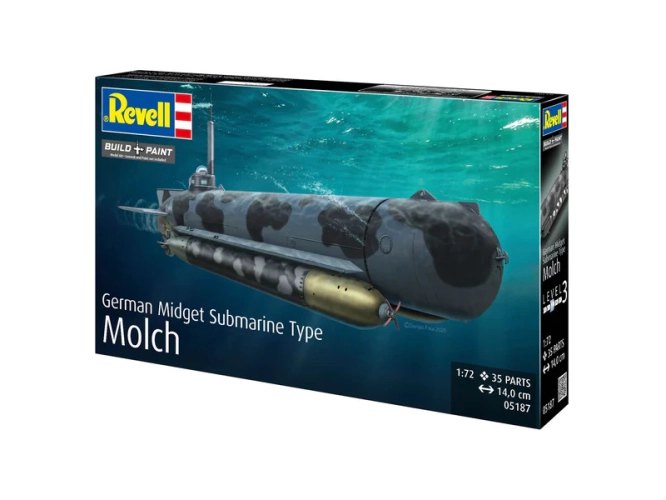 Plastikový model Revell 05187 - ponorka German Midget Submarine Type Molch v měřítku 1:72 ke slepení. Stavebnice obsahuje 35 dílků, obtížnost 3.