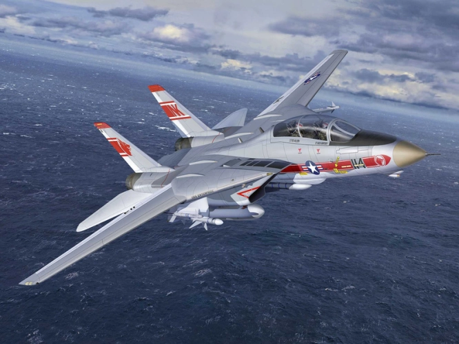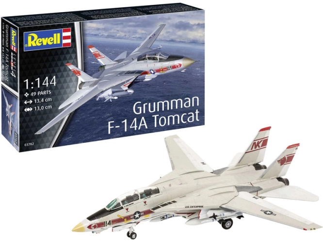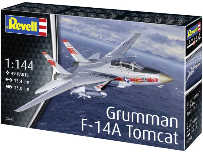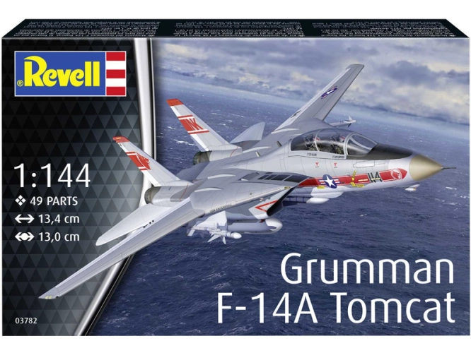 Plastikový model Revell 03782 - stíhačka Grumman F-14A Tomcat v měřítku 1:144 ke slepení. Stavebnice obsahuje 49 dílků, délka 134 mm, obtížnost 4.