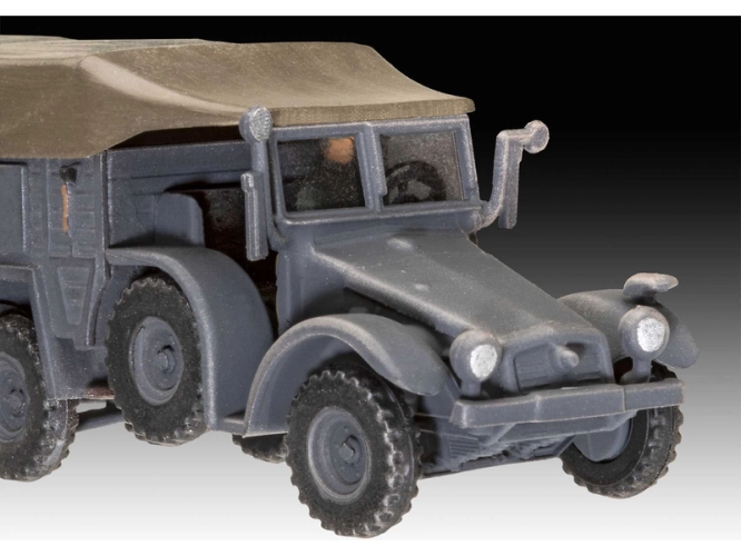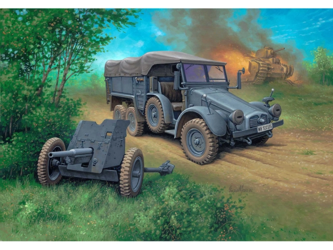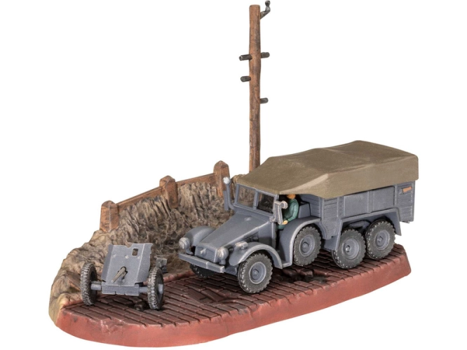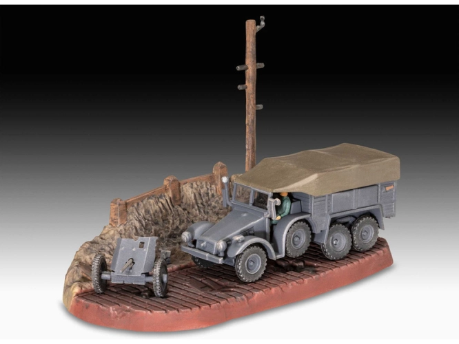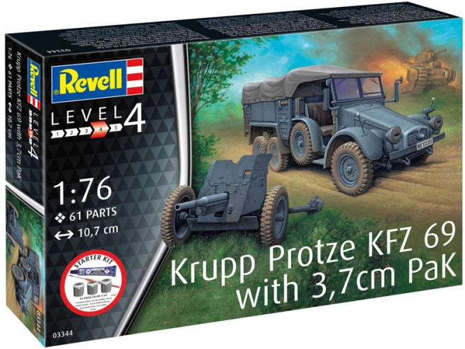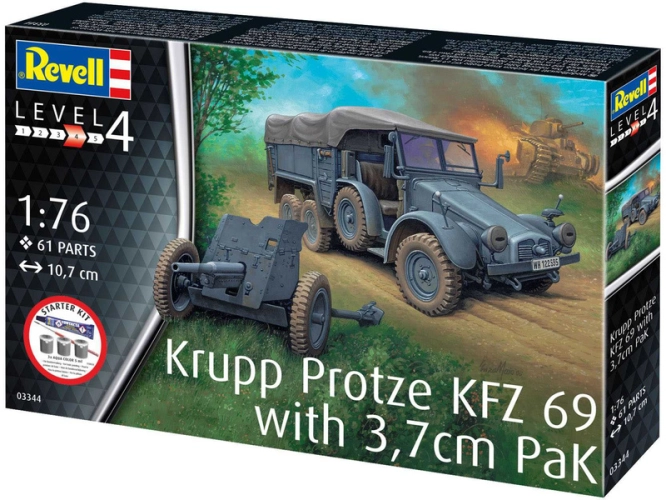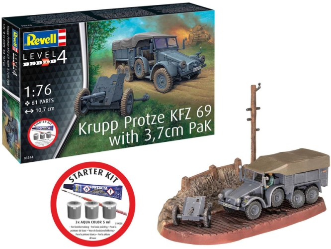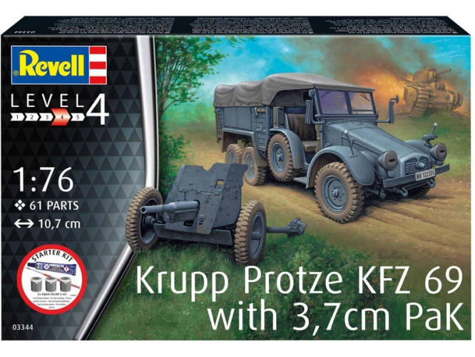 Plastikový model Revell 73344 – auto Krupp Protze KFZ 69 with 3,7cm Pak v měřítku 1:76 ke slepení. Stavebnice obsahuje 61 dílků, délka 107 mm, obtížnost 4.