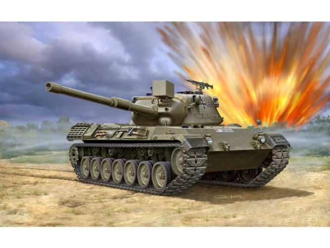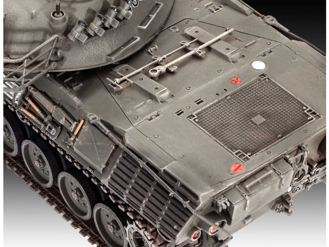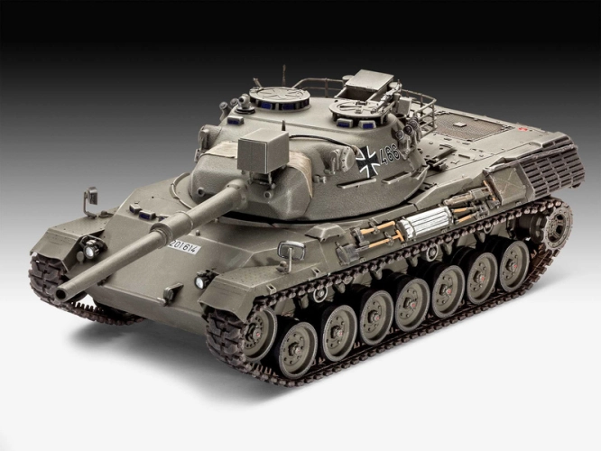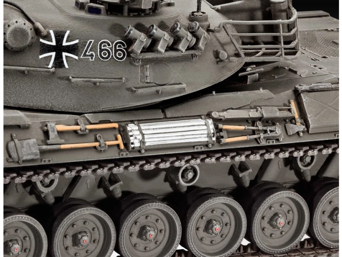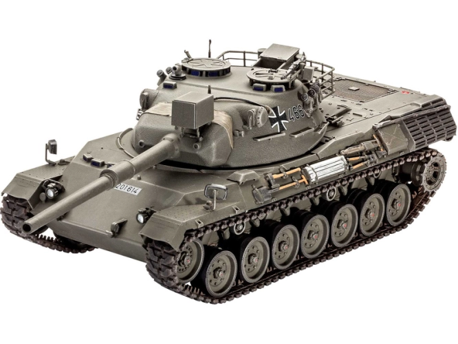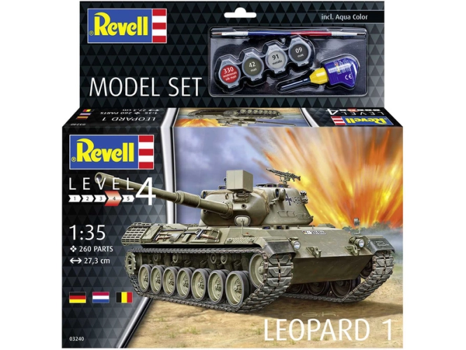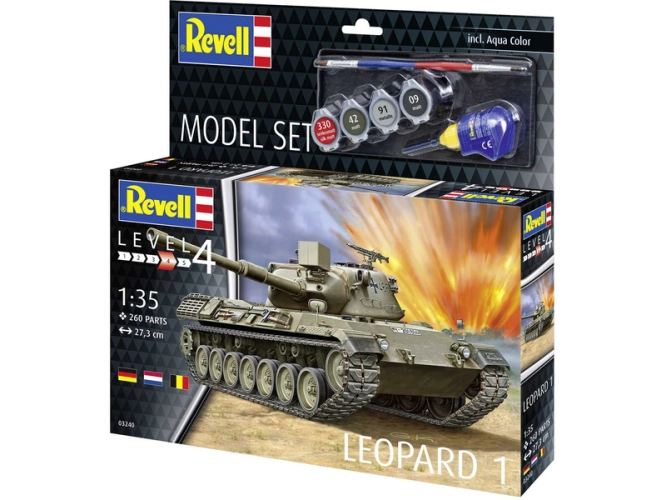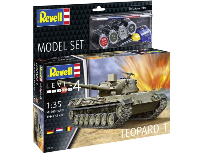 Plastikový model Revell 63240 - německý bojový tank Leopard 1 v měřítku 1:35 ke slepení. Stavebnice obsahuje 260 dílků, délka 273 mm, obtížnost 4.