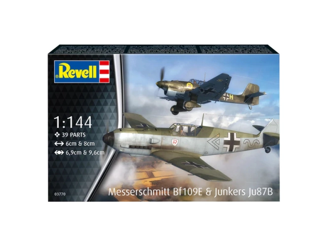 Plastikový model Revell 73770 – letadla Messerschmitt Bf109E & Ju87B Stuka v měřítku 1:144 ke slepení. Stavebnice obsahuje 39 dílků, délka 6/8 cm, obtížnost 3.