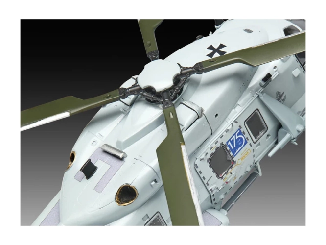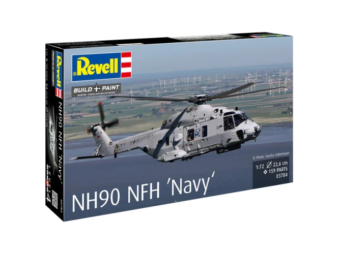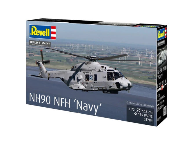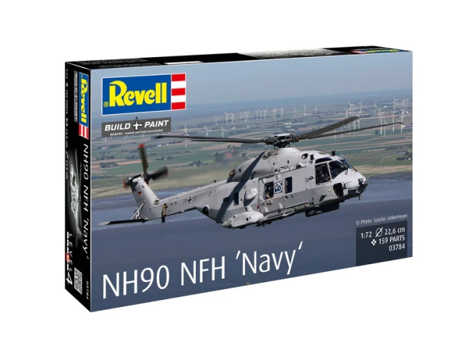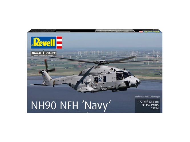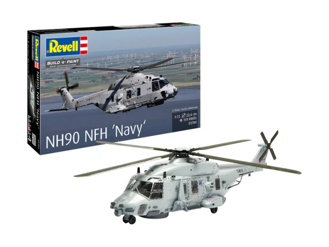 Plastikový model Revell 03784 - vrtulník NH90 NFH "Navy" v měřítku 1:72 ke slepení. Stavebnice obsahuje 159 dílků, rozpětí rotoru 226 mm, obtížnost 4.