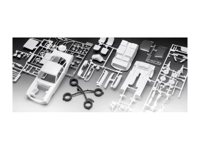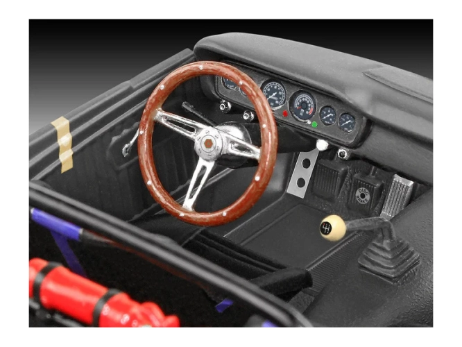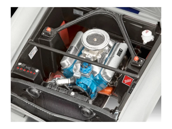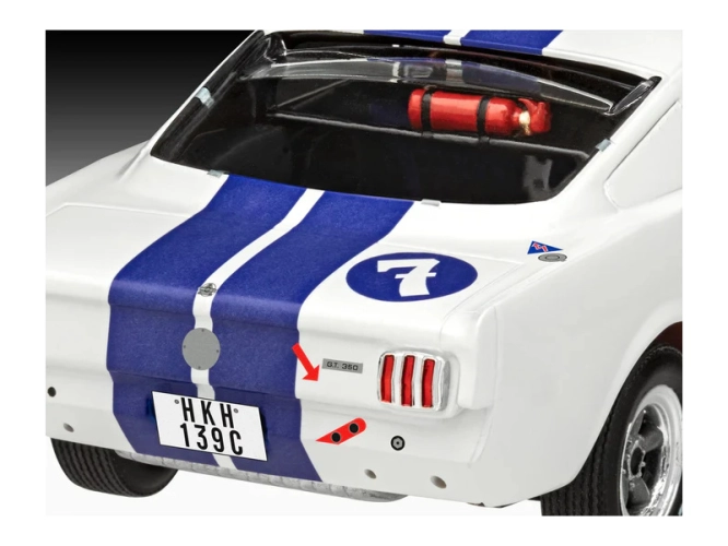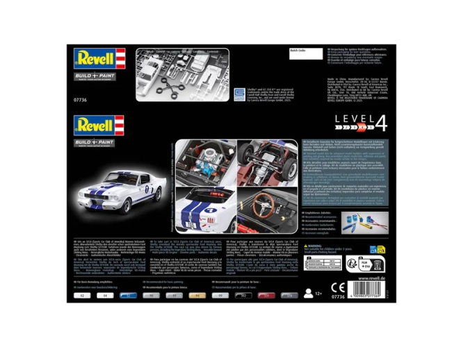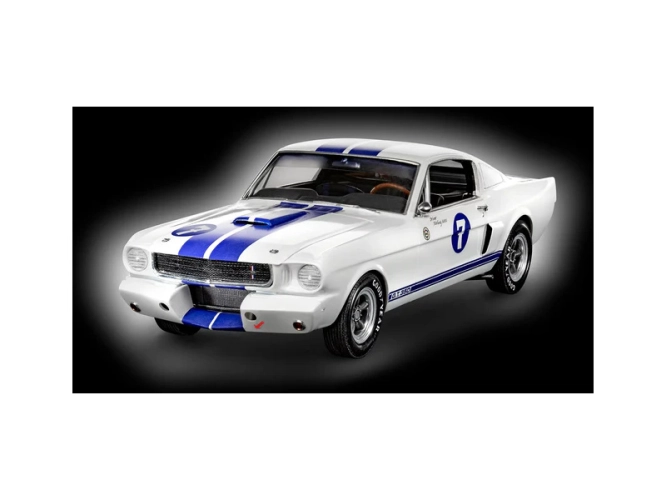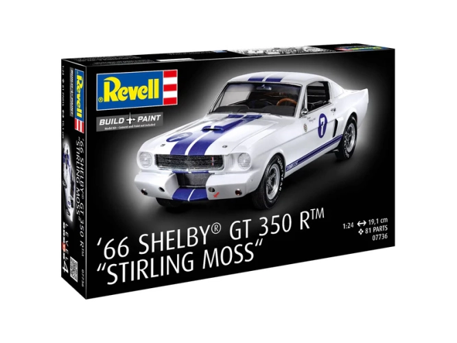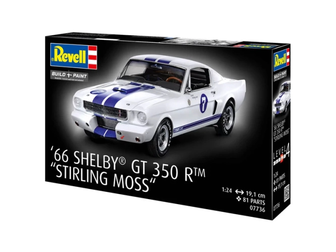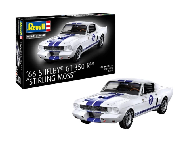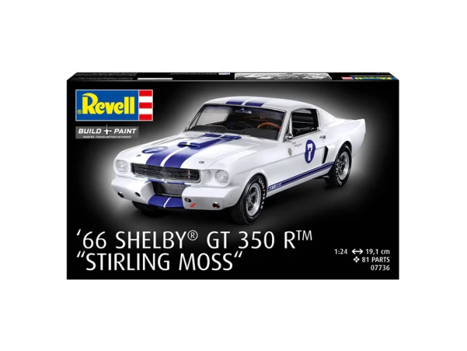 Plastikový model Revell 07736 – auto Shelby GT 350 R 1966 Stirling Moss v měřítku 1:24 ke slepení. Stavebnice obsahuje 81 dílků, délka 19,1 cm, obtížnost 4.