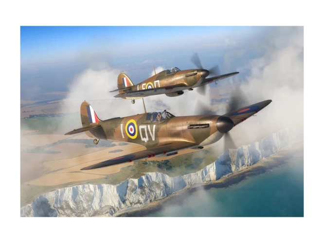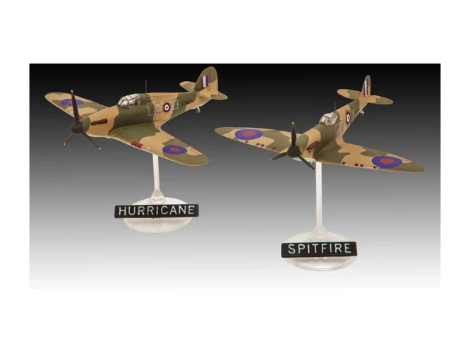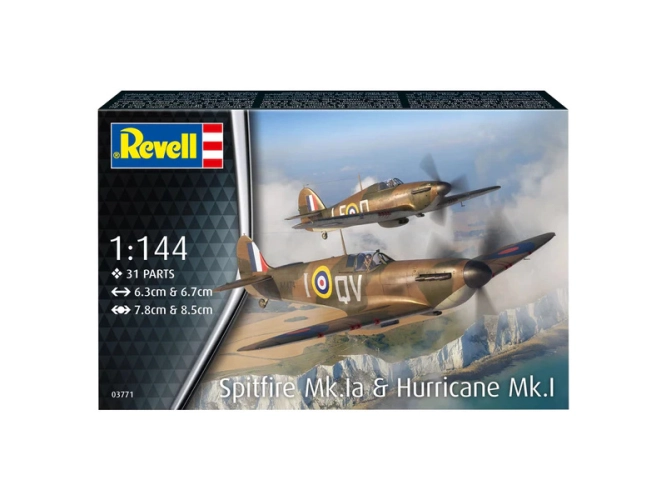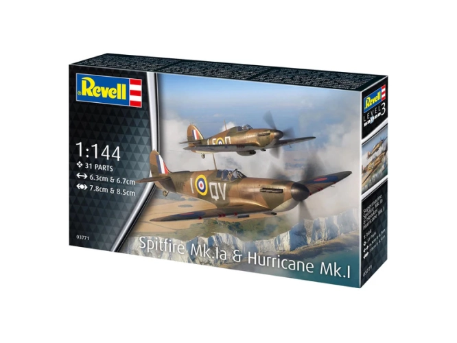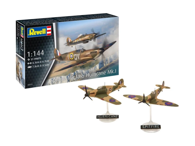Plastikový model Revell 73771 – letadla Spitfire Mk.Ia & Hurricane Mk.I v měřítku 1:144 ke slepení. Stavebnice obsahuje 31 dílků, délka 6.3/6.7 cm, obtížnost 3.