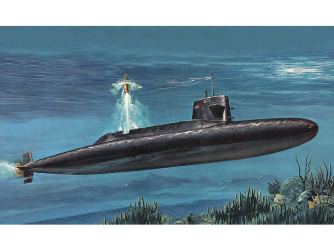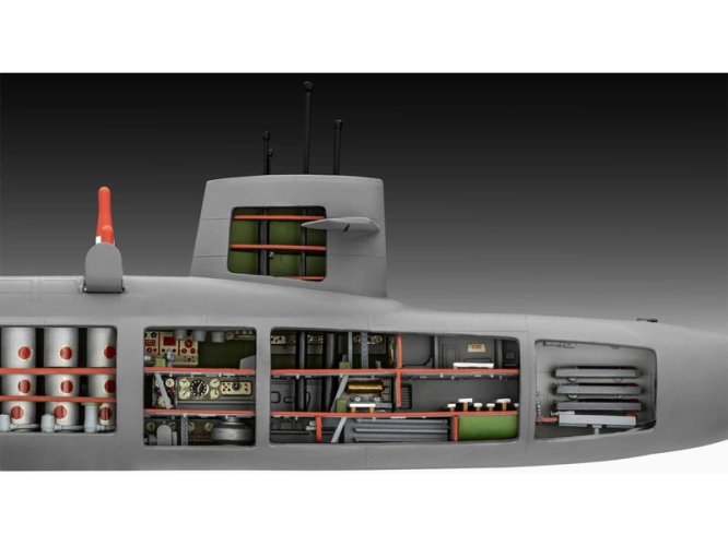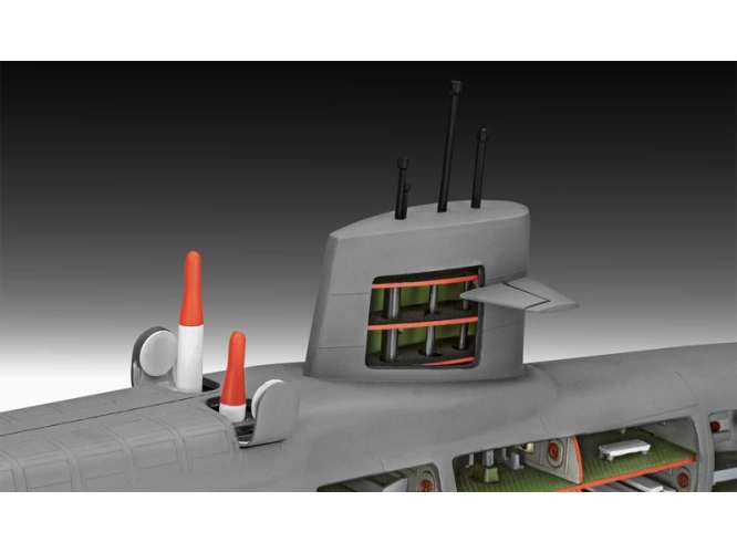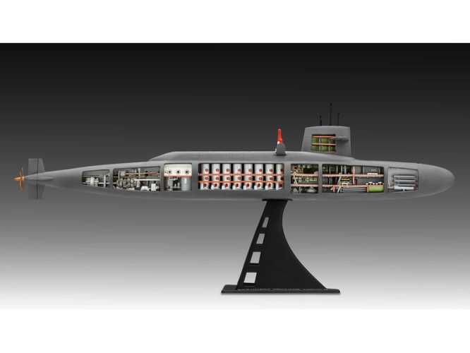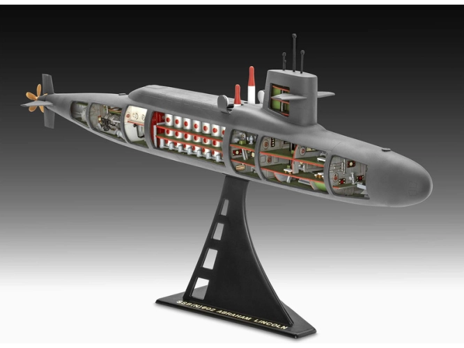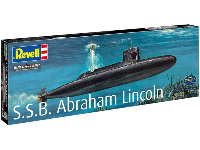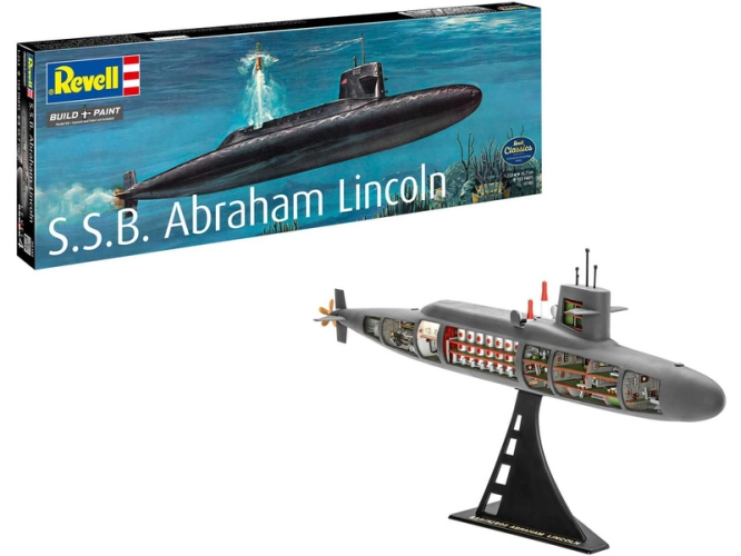 Plastikový model Revell 05185 – ponorka S.S.B. Abraham Lincoln with Interior v měřítku 1:253 ke slepení. Stavebnice obsahuje 158 dílků, délka 370 mm, obtížnost 4.