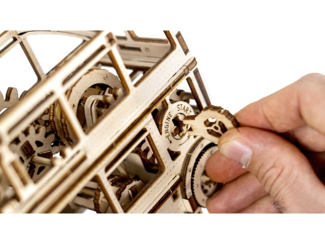 Vysoce kvalitní dřevěná stavebnice vyrobená z precizně laserem řezaných dílů, gumičky pro pohon, brusný papír.