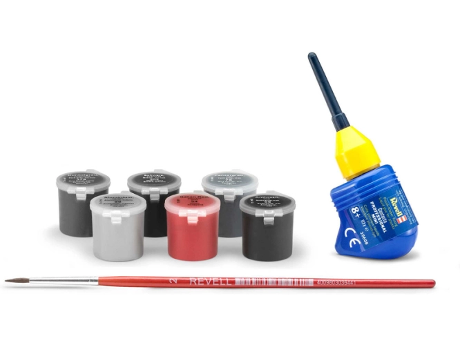 Plastikový model k sestavení, štětec, základní barvy, lepidlo, obtisky, návod.
