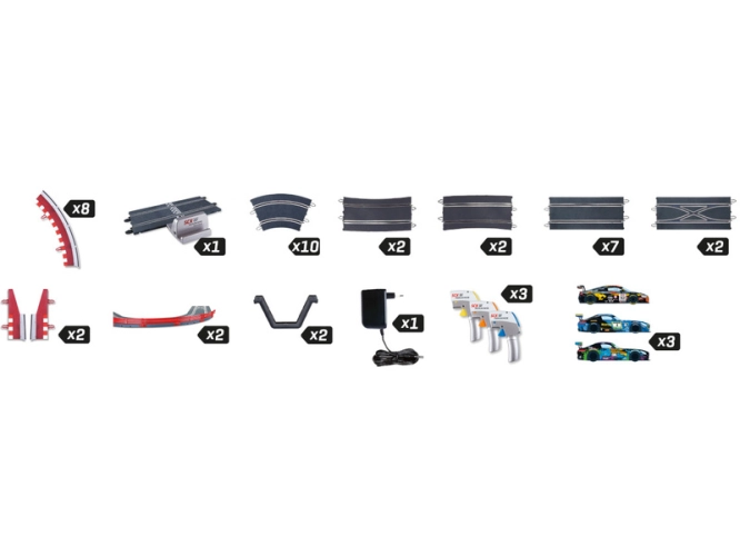 Balení obsahuje traťové díly, most, 2x křížení, svodidla, krajnice s mantinely, Bluetooth napájecí rovinku, 3x dráhové autíčko, 3x ovladač a napájecí zdroj. Návod CZ.