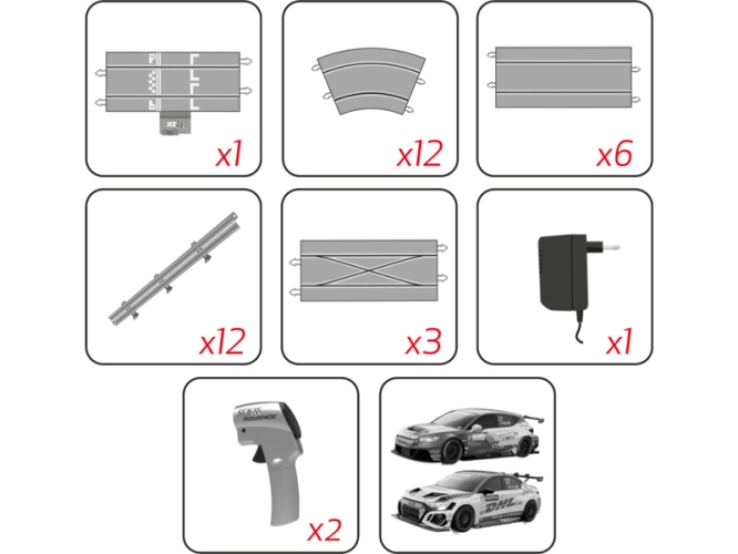Balení obsahuje traťové díly, 3x křížení, svodidla, 2x dráhové autíčko, 2x ovladač a napájecí zdroj. Návod CZ.