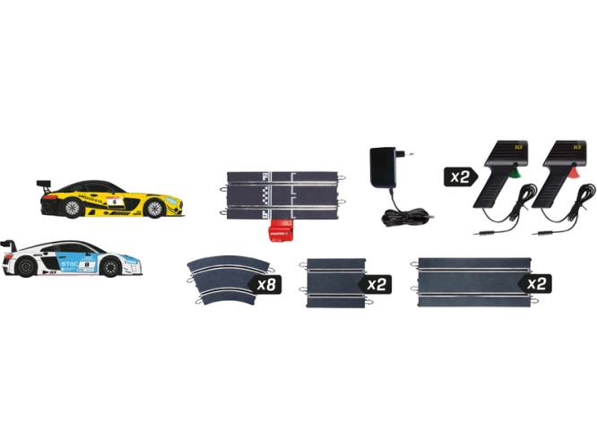Autodráha pro děti SCX Sprint Track v klasické měřítku 1:32 pro napínavější závody - analogová elektrická autodráha ve tvaru oválu. Dva ergonomické ovladače, dvě detailně zpracovaná dráhová autíčka Mercedes AMG GT3 a Audi R8 MS. Plocha pro rozložení: 148 cm x 83 cm. Délka tratě: 3,33 m. Složení tratě je velmi snadné, jednotlivé traťové díly zacvaknete do sebe, připojíte ovladače a můžete začít závodit.