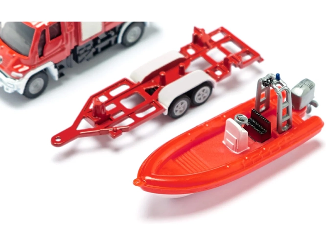 Kovový model požárního vozu Unimog s přívěsem a člunem od značky Siku, délka přibližně 17 cm, měřítko 1:87. Model obsahuje čirá okna, makety majáčků, dvounápravový přívěs je odpojitelný, člun plave na vodě. Vhodné pro hraní i sběratelství. Kvalitní zpracování z kovu a plastu. Baleno v blistru.