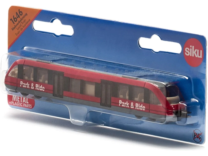 Kovový model příměstského vlaku od značky Siku, délka přibližně 18 cm, měřítko 1:120. Vlak s čirými okny a propracovaným interiérem je vybaven spřáhly vpředu a vzadu, což umožňuje zapojení více souprav. Vhodné pro hraní i sběratelství. Kvalitní zpracování z kovu a plastu. Baleno v blistru.