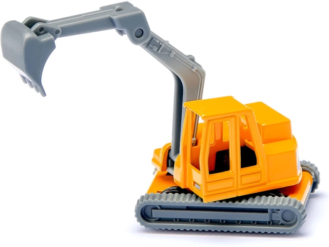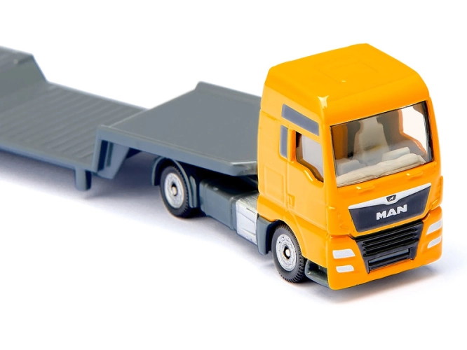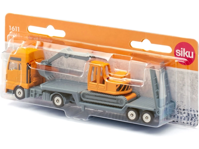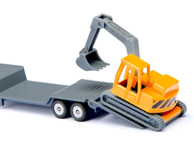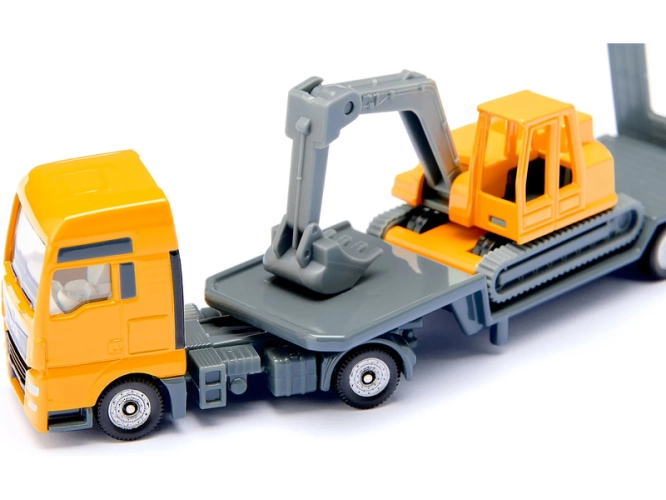 Kovový model tahače s podvalníkem a rypadlem, délka přibližně 16 cm. Tahač je vybaven čirými okny a gumovými pneumatikami. Návěs má sklopné nájezdy, rameno rypadla je pohyblivé a kabina je otočná. Vhodné pro hraní i sběratelství. Kvalitní zpracování z kovu a plastu. Baleno v blistru.