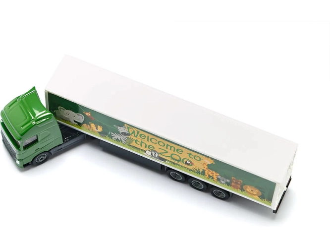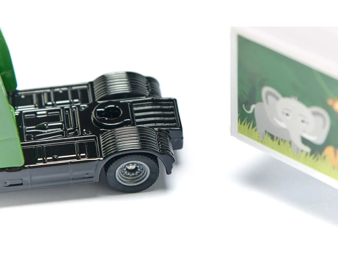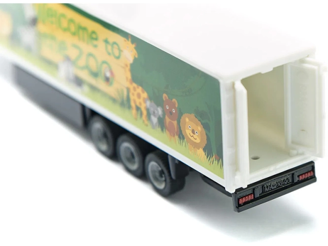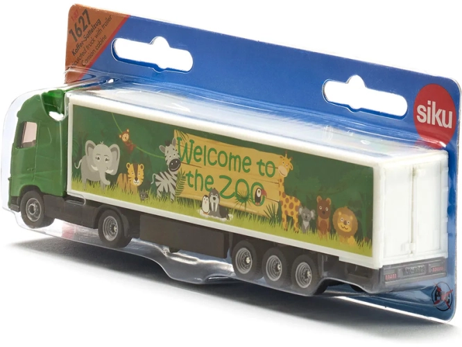Kovový model tahače Volvo se skříňovým návěsem od značky Siku, délka přibližně 19 cm, měřítko 1:87. Tahač je vybaven gumovými pneumatikami a čirými okny. Návěs je odpojitelný, zadní dveře jsou otevírací a má hravou grafiku s motivem zoo. Vhodné pro hraní i sběratelství. Kvalitní zpracování z kovu a plastu. Baleno v blistru.