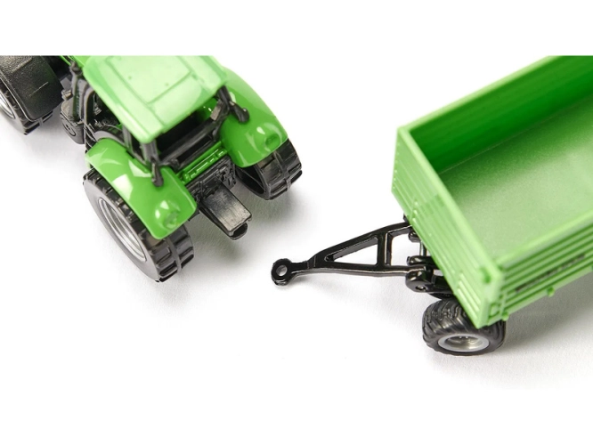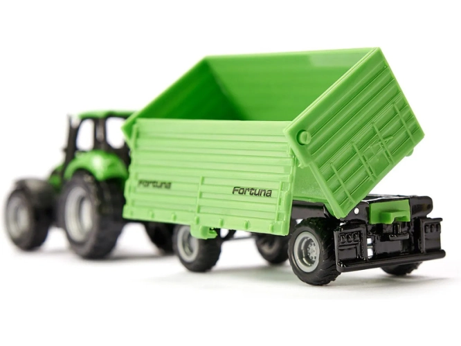 Kovový model traktoru DEUTZ-FAHR s vlečkou Fortuna, délka přibližně 17 cm. Traktor je vybaven tažným zařízením, odnímatelnou střechou a gumovými pneumatikami. Vlečka je odpojitelná, má otočnou přední nápravu, vyklápěcí krobu do strany a otevírací boční čelo. Vhodné pro hraní i sběratelství. Kvalitní zpracování z kovu a plastu. Baleno v blistru.