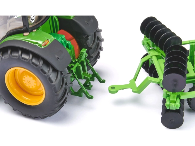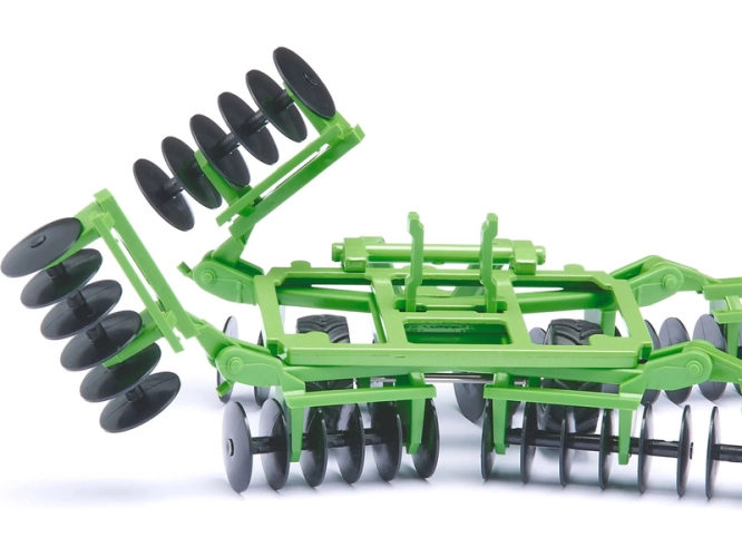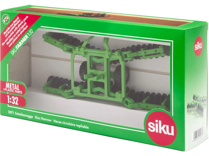 SIKU Farmer model talířové brány v měřítku 1:32. Model má otočné gumové pneumatiky, pohyblivé plastové disky a sklopná ramena pro přepravu. Určeno jako příslušenství pro traktory Siku z řady Farmer 1:32. Kvalitní zpracování z kovu a plastu.