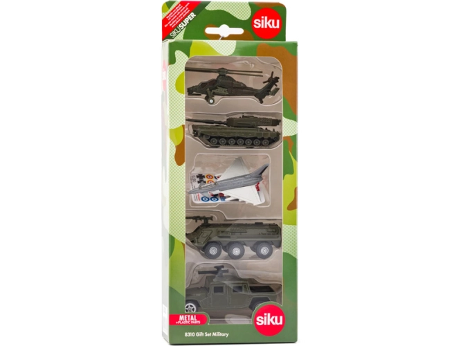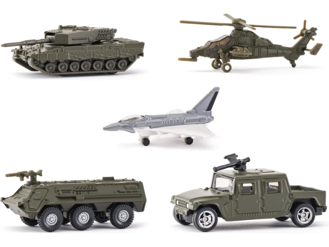 Sada 5 kovových modelů Military od značky Siku. Sada obsahuje tank, bojový vrtulník, stíhačku, obrněný transportér a obrněné vozidlo Desert Storm. Vhodné pro hraní i sběratelství. Kvalitní zpracování z kovu a plastu.