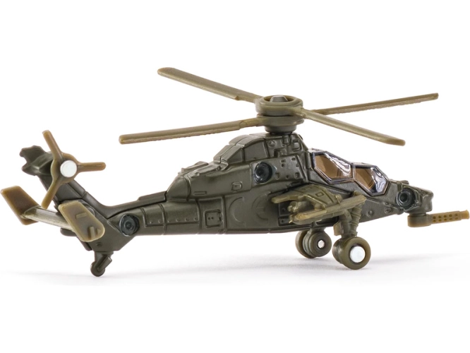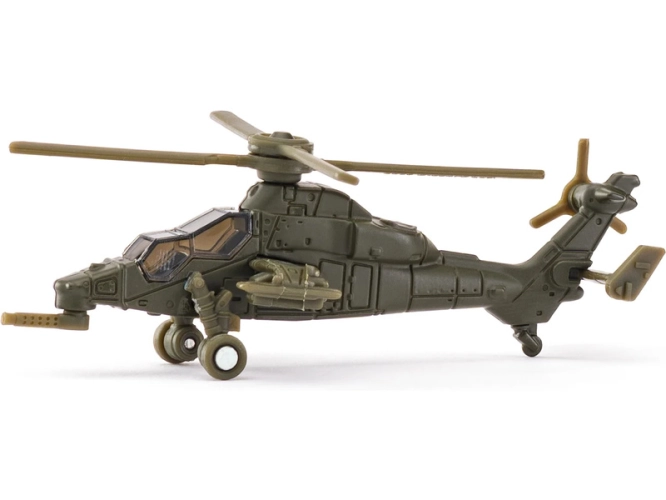 Bojový vrtulník - Vrtulník má otočné vrtule hlavního i ocasního rotoru a je vybaven maketami závěsných střel a předního kulometu.