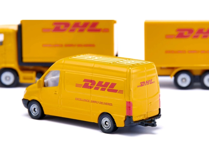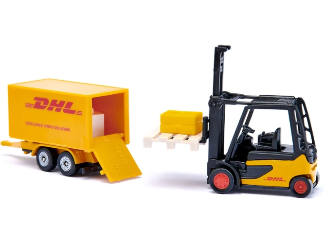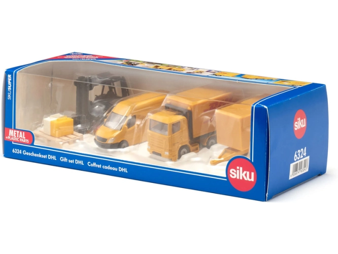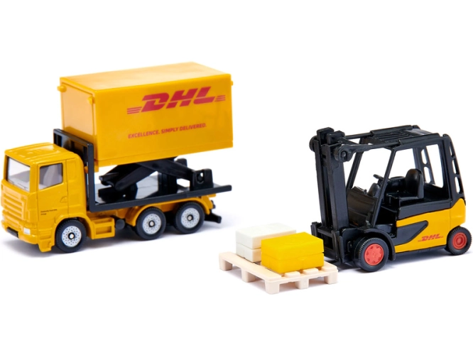 Sada kovových modelů DHL od značky Siku. Sada obsahuje kamion se zdvižným nůžkovým mechanismem korby a s odpojitelným přívěsem, dodávku a vysokozdvižný vozík s pohyblivými vidlemi a paletou s kufry. Modely mají čirá okna. Vhodné pro hraní i sběratelství. Kvalitní zpracování z kovu a plastu.