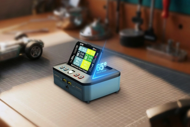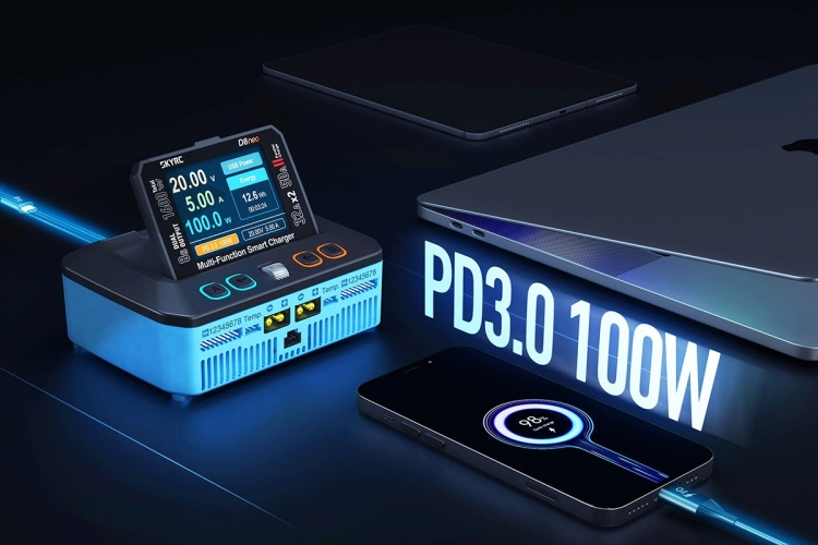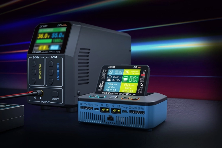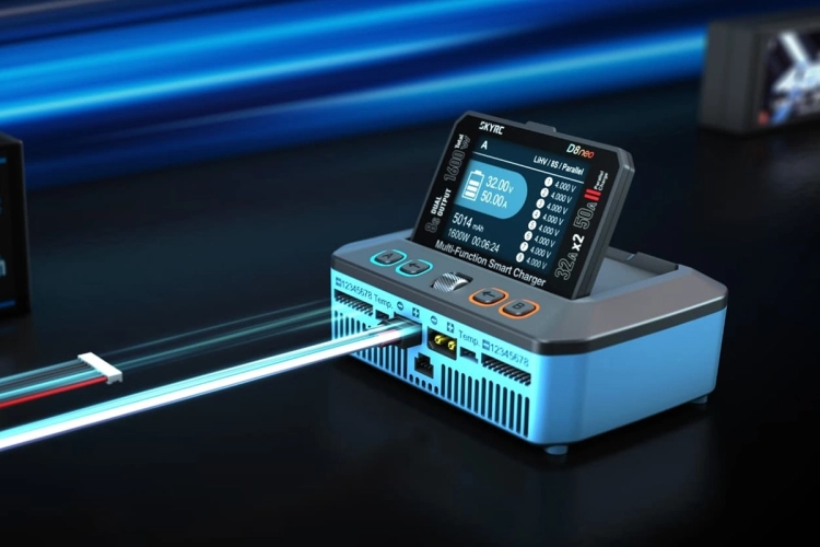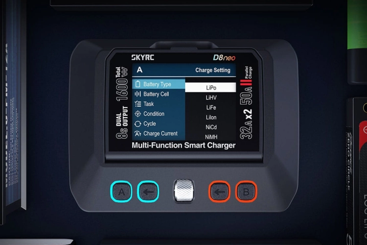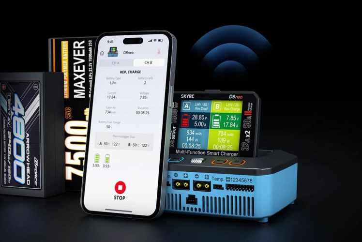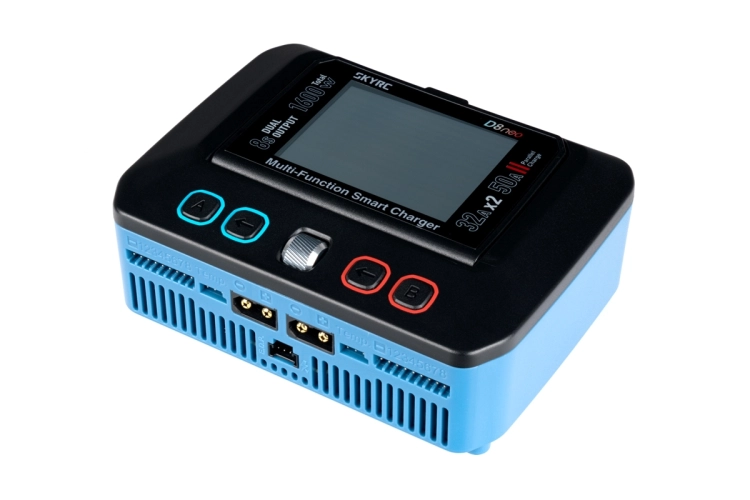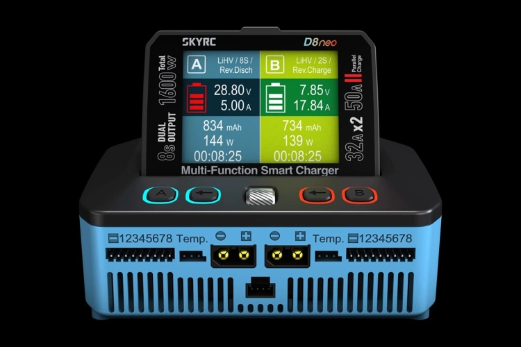 Dvoukanálový nabíječ SKY RC D8neo 1600W byl konstruován pro rychlé nabíjení dvou akumulátorů s vyšším počtem článků velkými proudy současně, s jednoduchou obsluhou a možností komunikace s aplikací SkyCharger. D8neo umožňuje nabíjet a vybíjet běžné typy článků (NiCd, NiMH, Li-poly, Li-ion, Li-Fe, Li-HV, Pb), navíc jsou oba kanály vybaveny vestavěnými osmikanálovými balancery, které zajišťují velmi bezpečné a komfortní nabíjení lithiových akumulátorů. Může také pracovat v režimu paralelního nabíjení, kdy oba kanály nabíjejí jeden akumulátor proudem 33-50 A. Při připojení externího vybíječe BD380 nebo BD380+ potom umožňuje vybíjení proudem až 40 A při max výkonu 380 W a nabízí také režim rekuperačního vybíjení s výkonem až 1100 W. Kromě nabíječe D8neo má také vestavěný stabilizovaný napájecí zdroj s nastavitelným výstupním napětím 5-36 V a proudem 0,3-32 A.