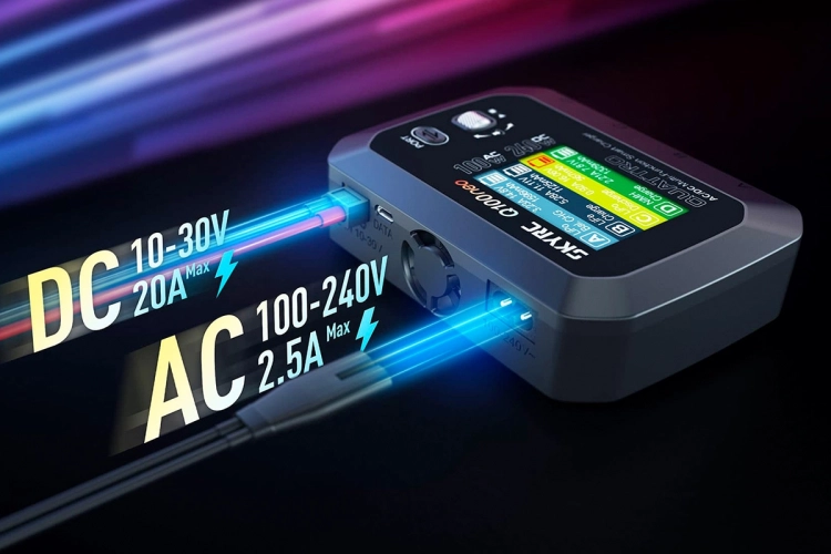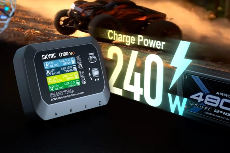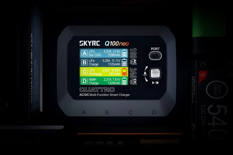 Čtyřkanálový nabíječ SKY RC Q100neo 240W byl konstruován se snahou poskytnout vše potřebné pro nabíjení čtyř akumulátorů - spíše menší kapacity - současně „pod jednou střechou\" včetně síťového zdroje, s jednoduchou obsluhou. Q100neo umožňuje nabíjet a vybíjet běžné typy článků (NiCd, NiMH, Li-poly, Li-ion, Li-Fe, Li-HV, Pb), navíc jsou všechny kanály vybaveny vestavěnými čtyřkanálovými balancery, které zajišťují velmi bezpečné a komfortní nabíjení lithiových akumulátorů.