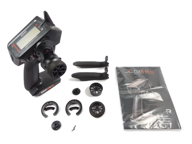Balení obsahuje RC vysílač DX5 Pro 2021, přijímač, úhlové vložky 10˚ a 15˚, 2x náhradní rukojeť, menší volant, omezení rozsahu volantu 32°, 36°, náhradní kolo volantu. Návod CZ a manuál EN, DE, FR, IT.