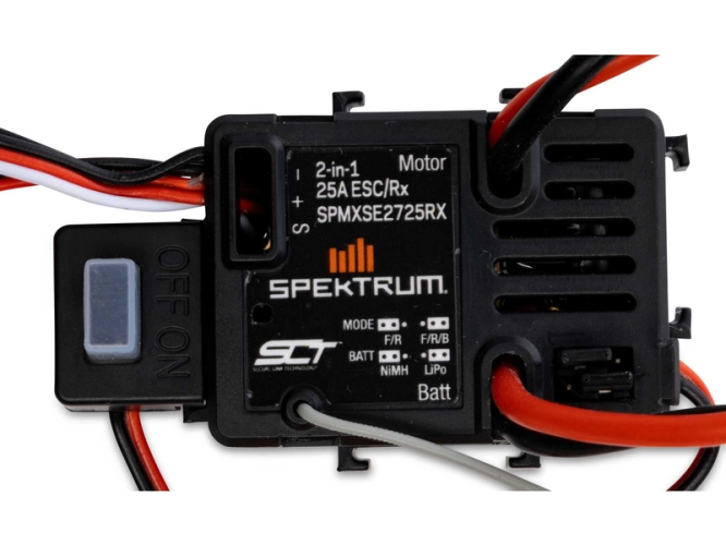 Spektrum stejnosměrný regulátor 25 A s přijímače SLT pro RC menší RC modely aut v měřítku 1:18. Konektor pro zapojení akumulátoru IC2.