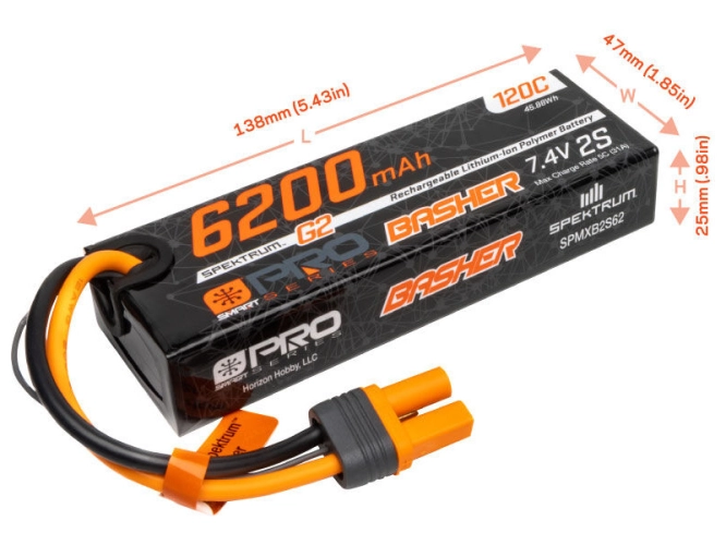 Baterie Smart LiPo 2S 6200mAh 120C Smart G2 Pro IC5, se speciálně vyvinutou technologií Graphene LiPo High Discharge Chemistry pro trvale vyšší napětí po celou dobu provozu baterie i při extrémním proudovém zatížení. Delší životnost a lepší výkon. Rozměry 138 x 48 x 26 mm. Hmotnost: 360 g.