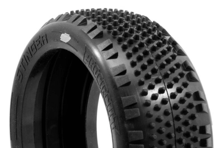 Pneumatika Stinger je speciálně navržena pro astroturfové a kobercové dráhy s vysokou přilnavostí. Je vybavena centrálním vzorkem dlouhých pinů v kombinaci s úhlovými bočními bloky, které zajišťují přímou trakci vpřed a zároveň snižují nadměrný boční záběr při vysokých rychlostech. Výsledkem je čistější a kontrolovanější zatáčení, ideální pro přední nápravu nebo setupy, které upřednostňují snadné a předvídatelné ovládání.