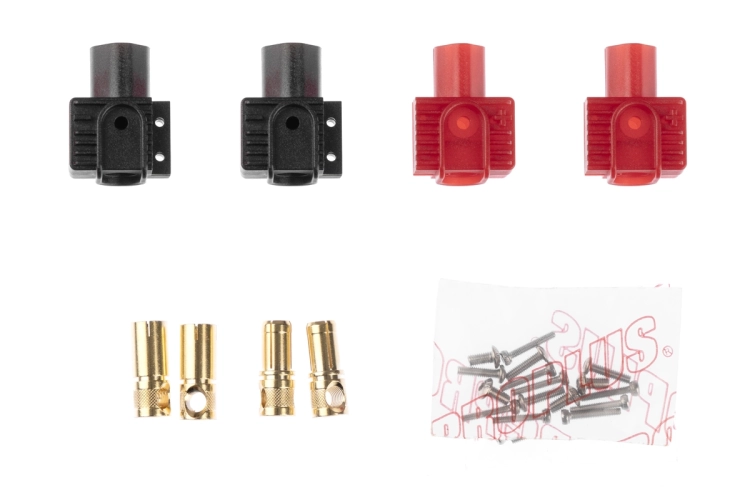Zlacené 7mm konektory s domkem pro montáž do rámu vrtulníků SAB Goblin 700 Pro/RAW/KSE. Zastrčením pohonné baterie do slotu dojde k zapojení konektorů. Varianta s kolmým přívodem kabelu do konektoru. Pro 8,4mm2 (8AWG) kabel, konstantní proud 280A, špičkový 350A. Max 60V DC. Nepájecí varianta - kabel je zajištěn pomocí imbusového červíku. Balení 2 páry (2x černý a 2x červený konektor) pouze pro Akku. Objednací kód výrobce RAS7808 D7 SAB BAT2.